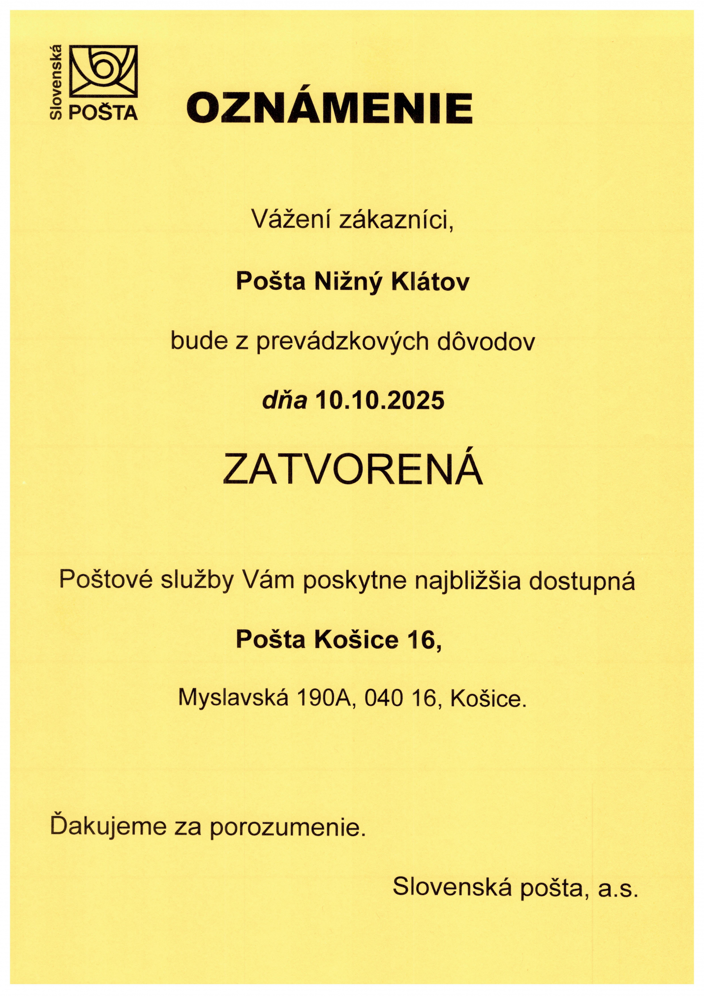 POŠTA - 26.9.2025 - ZATVORENÁ