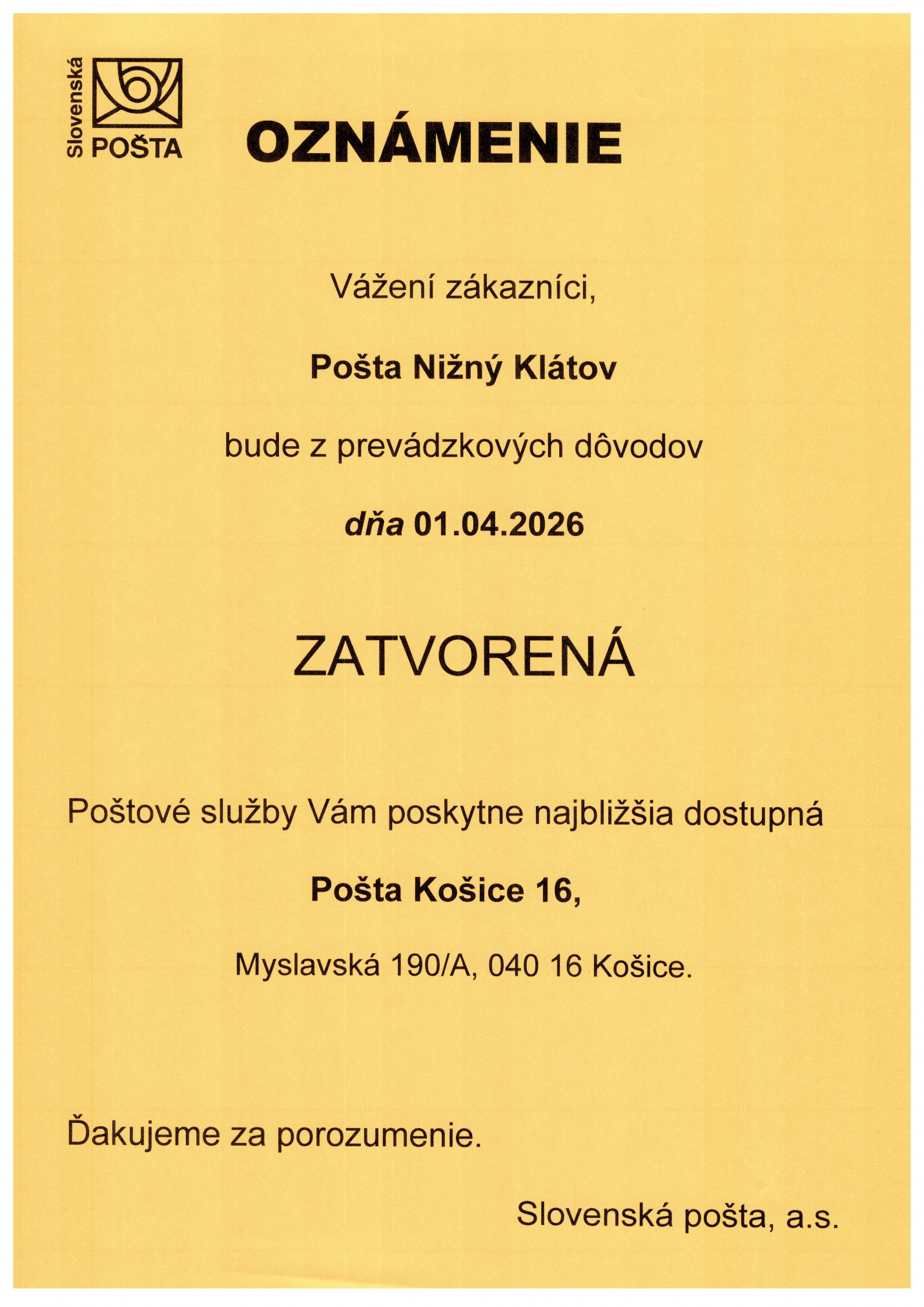 OZNAM - pošta ZATVORENÁ 1.4.2026