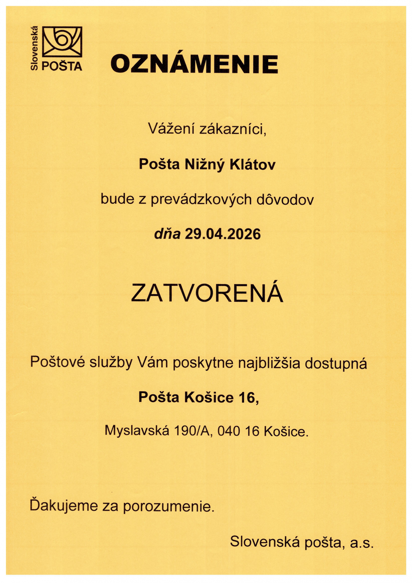 OZNAM - pošta Zatvorená 29.4.2026