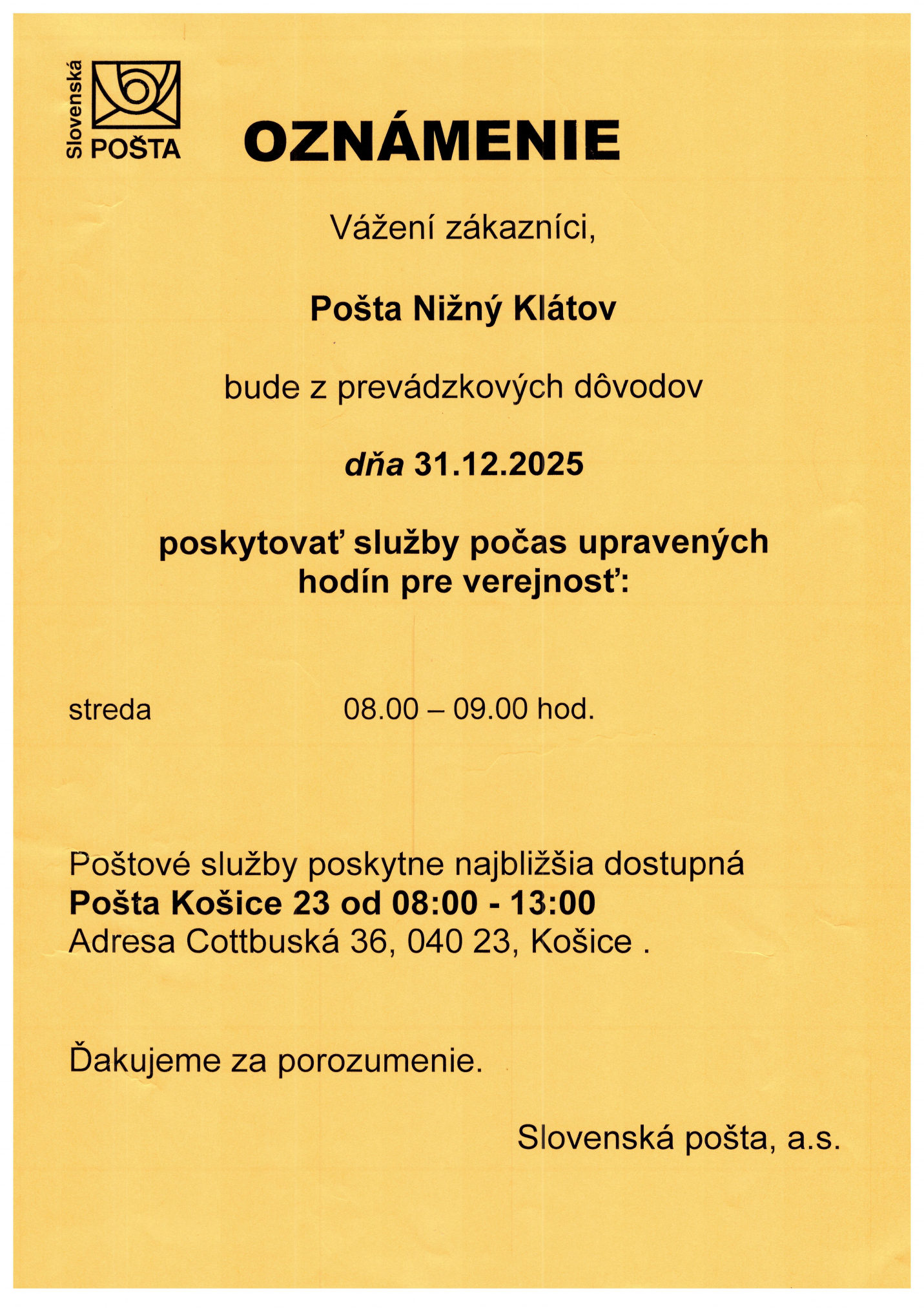 OZNAM - pošta zatvorená 12.12.2025